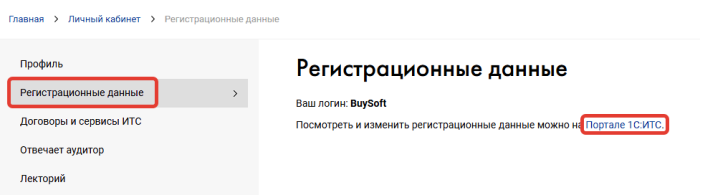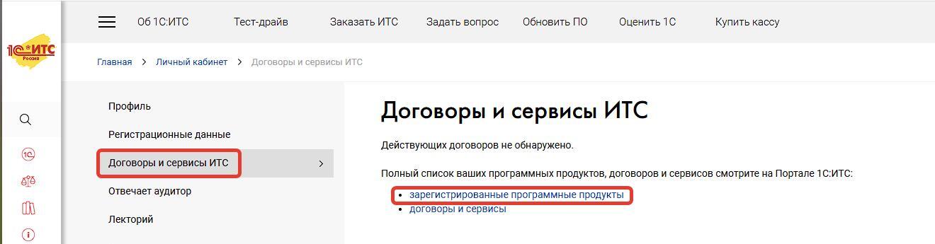 Когда учетная запись активирована, можно переходить к регистрации самого программного продукта. В личном кабинете портала ИТС откройте раздел с договорами и сервисами и выберите пункт с зарегистрированными программными продуктами.